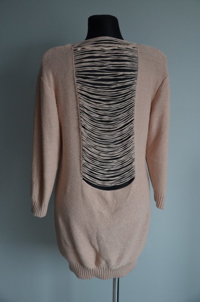 Bardzo stylowy sweter znanej marki ATMOSPHERE. Piękny bladoróżowy kolor. Krój prosty, długi, luźny. Dekolt okrągły. Rękawy 3/4 zakończona ściągaczami. Dół sweterka z ażurowymi paskami, zakończony ściągaczem. Największą ozdobą sweterka jest bardzo oryginalnie i zmysłowo ozdobiony tył.
