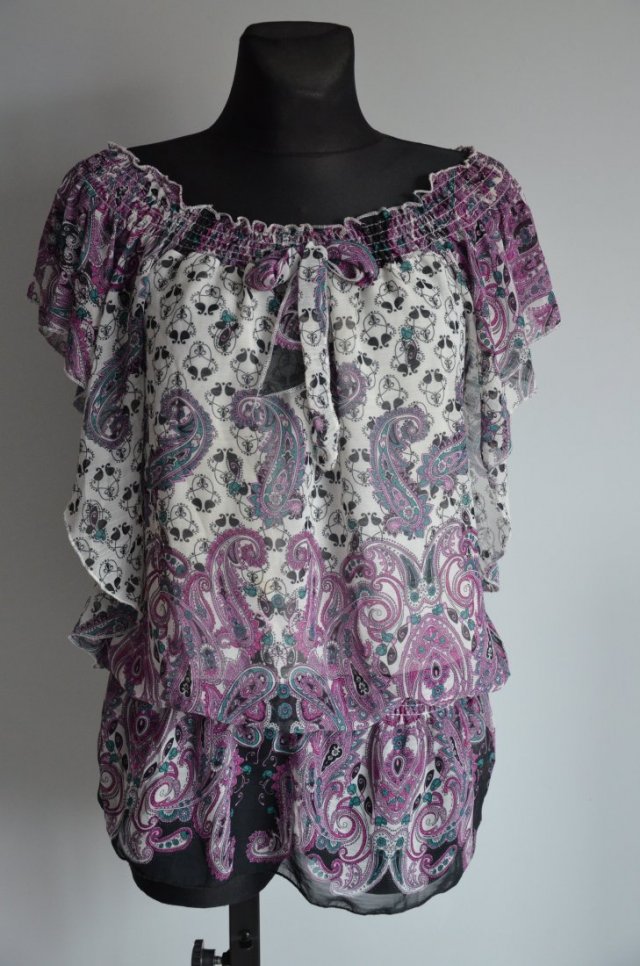 Świetna bluzeczka utrzymana w luźnym stylu Boho. Kolorowa i wzorzysta, ozdobiona kokardką na dekolcie. Dekolt na cienkich gumeczkach, w łódkę. Elastyczny, można nałożyć na ramiona. Boki w kroju motyla, rękawki szerokie ale krótkie, opadające jak fale. Pas na gumeczkach, elastyczny. Dół opadający swobodnie, luźny. W górnej części podszewka.