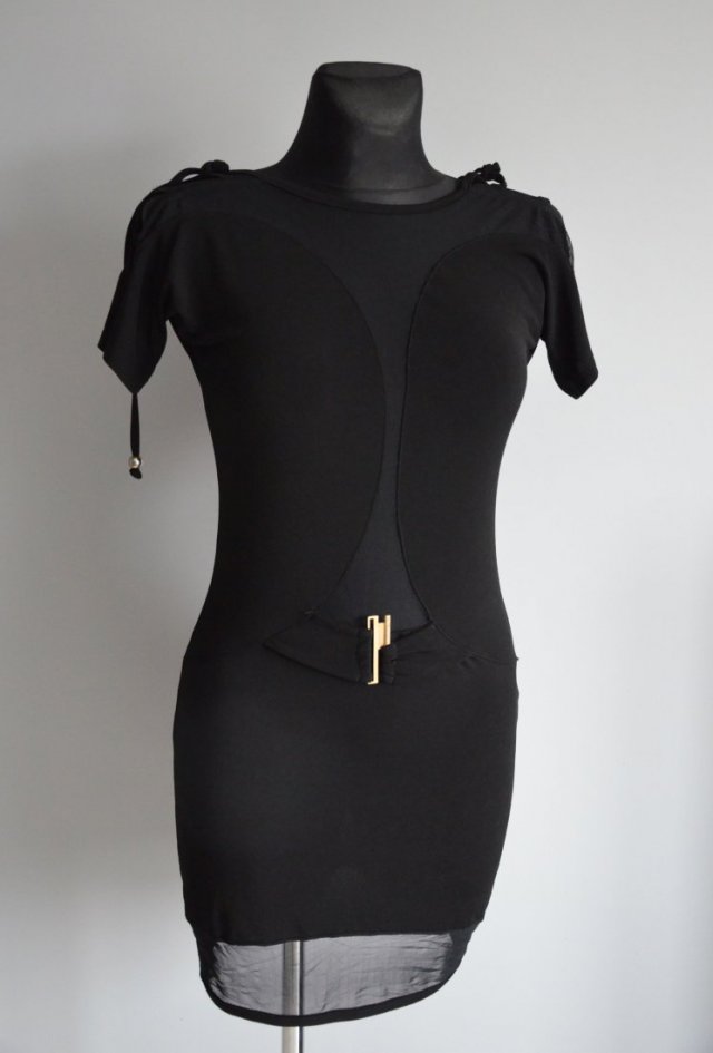 Oryginalna mała czarna w zmysłowym wydaniu. Marka EXZOTICA. Bardzo stylowa i pomysłowa. Krój prosty. Na przodzie w linii T przeźroczysty woal. Ozdobna klamra na pasie. Sam dół (ok 8 cm) również przeźroczysty. Tył pleców z wcięciem. Bardzo oryginalna na ramionach, łączona jedynie krótkimi paseczkami odsłaniając ciało. Z ramion odchodzą ozdobne paseczki zakończone kulkami w kolorze złota.