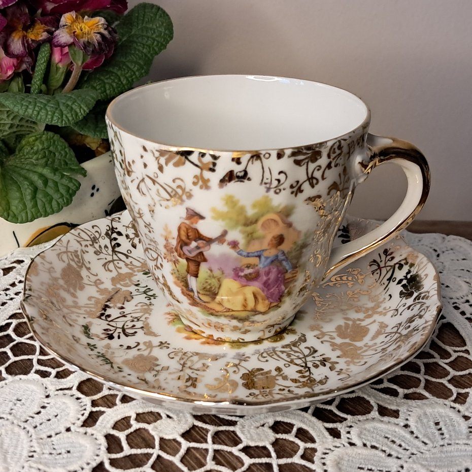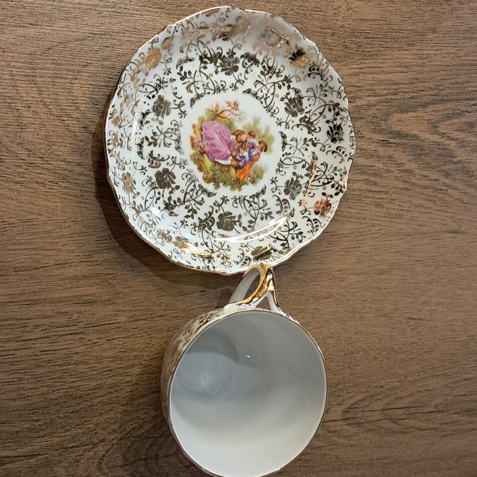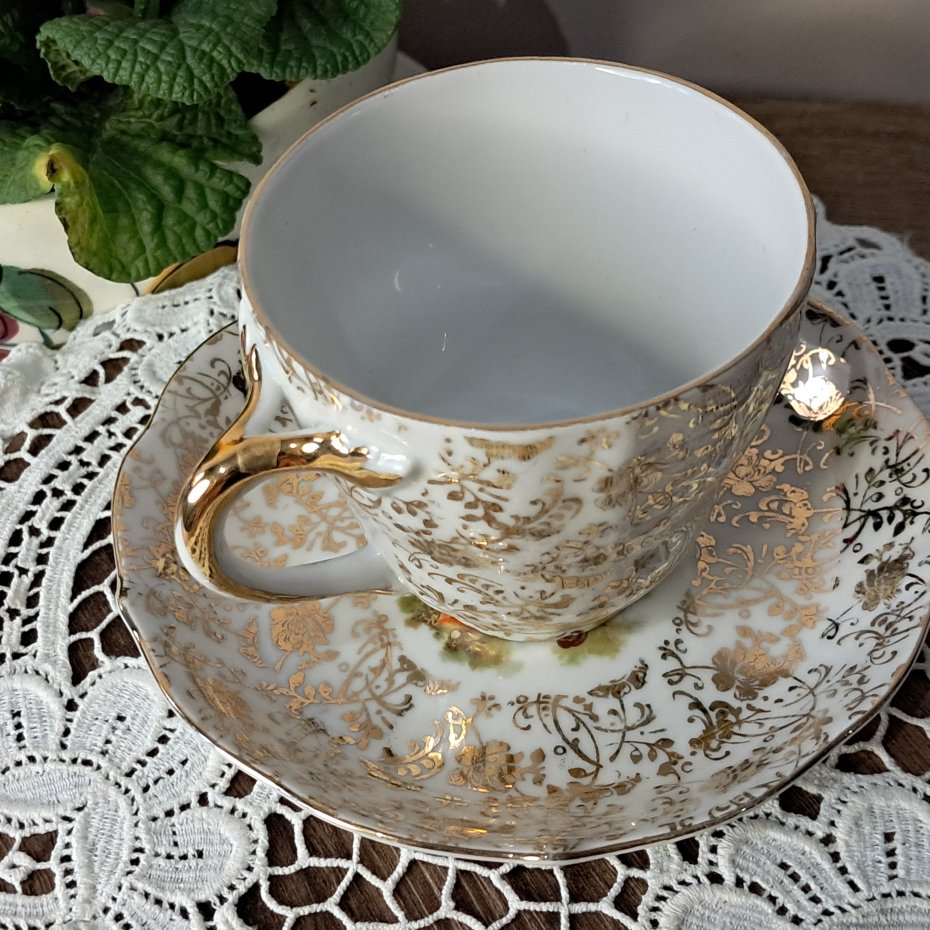 Piękna porcelana kolekcjonerska lub do codziennego użytku w stylu vintage. Wymiary: filiżanka: wysokość 7 cm, pojemność 150 ml, spodek: średnica 12 cm