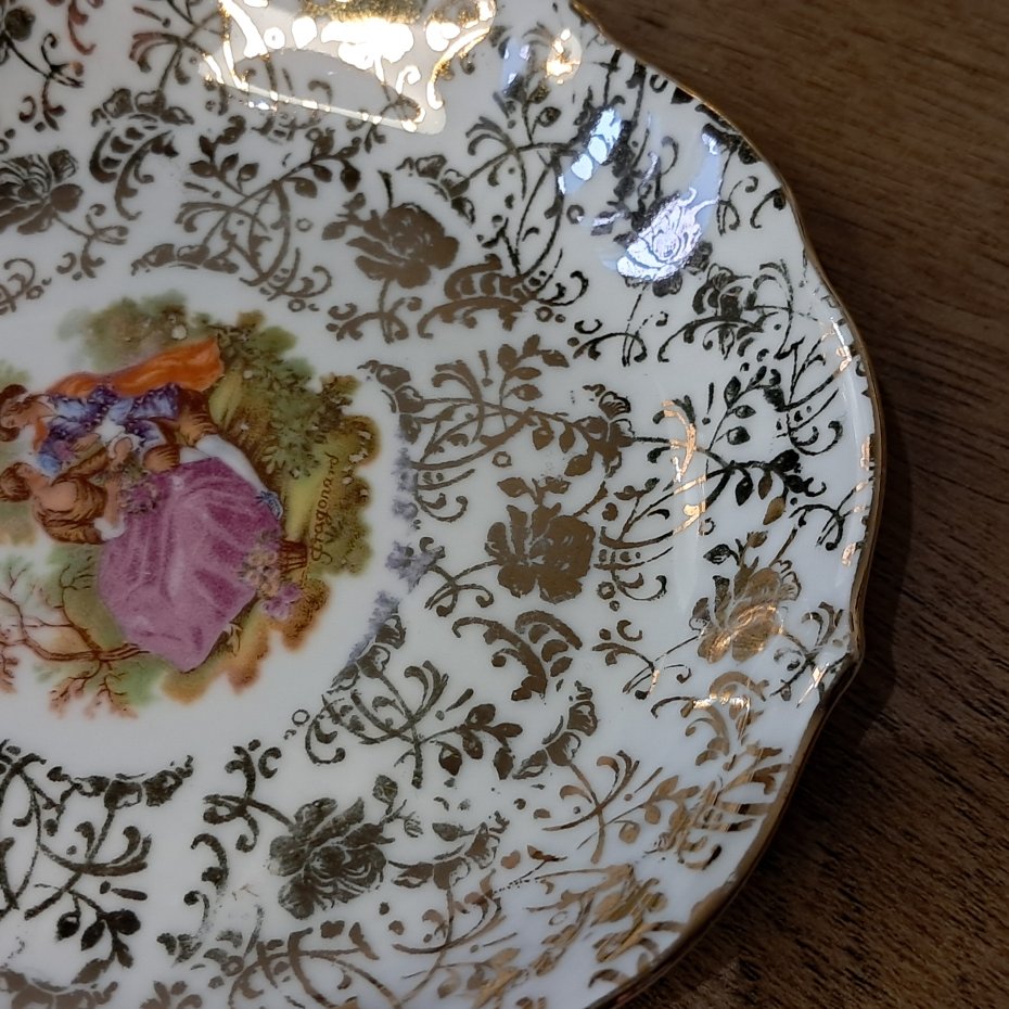 Dekor w popularnym wzorze Fragonard – romantyczna scena dworska w stylistyce rokoka oraz bogate złocenia.