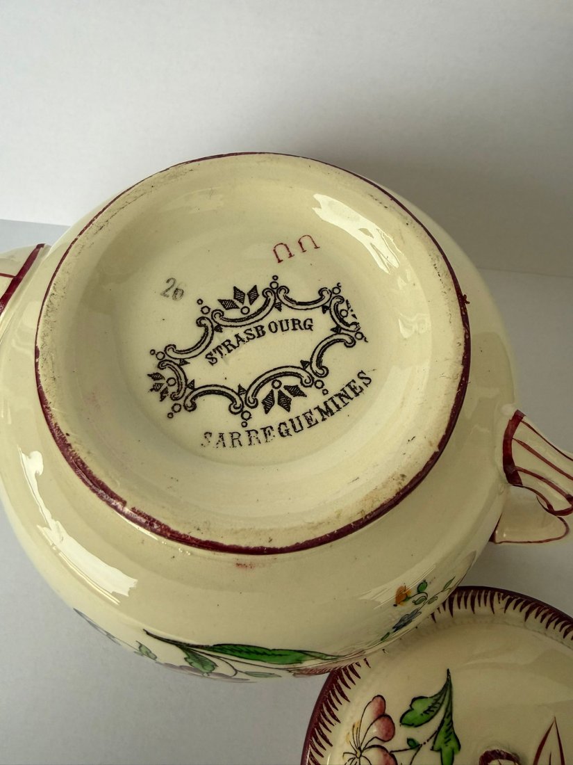 Oryginalna sygnatura na spodzie: "Strasbourg / Sarreguemines" stosowana już od 1880 roku