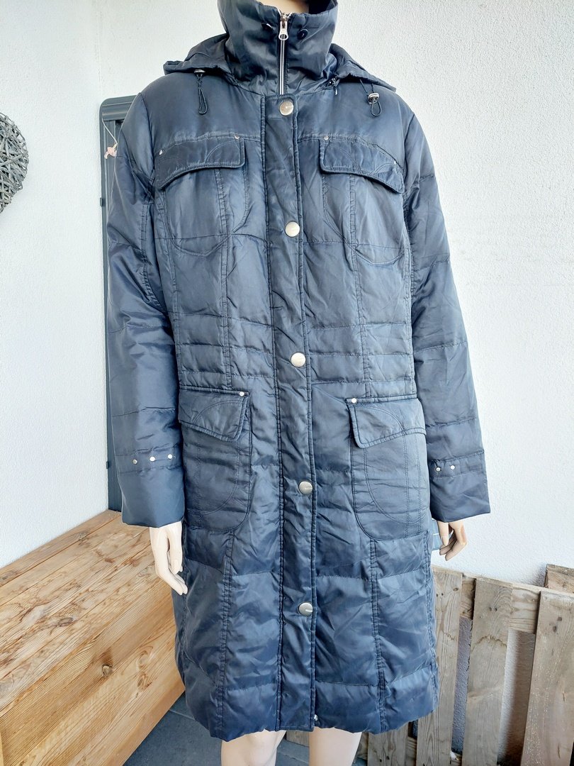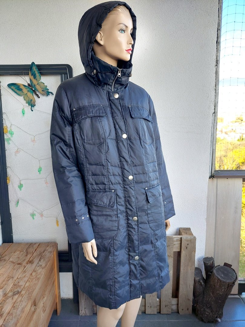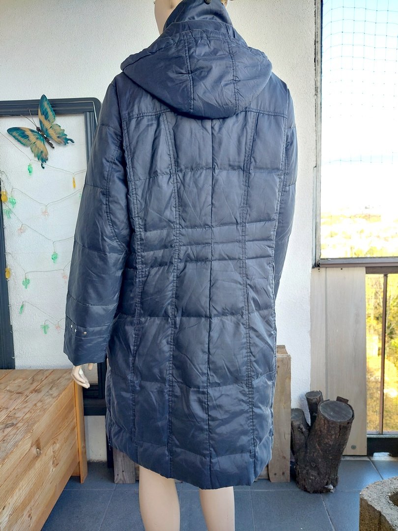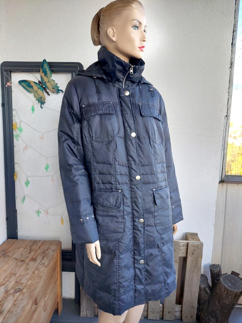 długi płaszcz przejściowy marki canda, wypełnienie 90% pierze 10% puch. zapinany na zamek i zatrzaski, kolor czarny. materiał 90% poliester 10% nylon. stan bardzo dobry, delikatne ślady normalnego użytkowania (gumka ściągająca kaptur jest trochę rozciągnięta). rozmiar z metki brak. proszę sprawdzić wymiary. na manekinie małe 38.