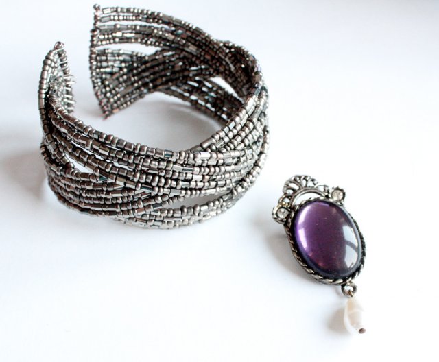 Przepiękna bransoletka z drobniutkich koralików w kolorze srebrnym.