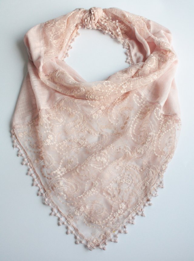 Absolutnie wyjątkowa chusta wykonana z koronki oraz miękkiej, delikatnej tkaniny. Kolor stonowany pudrowy róż z nutą beżu.