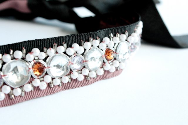 Efektowny wyszywany koralikami dodatek, który można nosić na wiele sposobów. Świetnie sprawdzi się jako pasek do małej czarnej lub opaska do włosów.