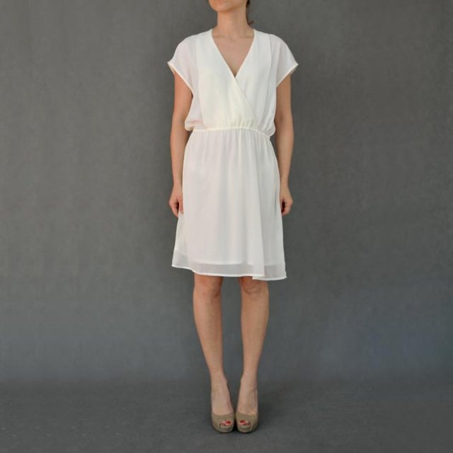 Śliczna, zwiewna sukieneczka marki H&M w leciutko złamanej bieli. W talii gumka i ciekawe zakładki przy dekolcie. Minimalistyczna. Polecam. Świetnie będzie prezentować się z długimi, grubymi swetrami - czyli wersja nie tylko na lato.