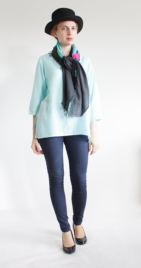 Błękitna bluzka wykonana z cienkiej, przewiewnej tkaniny, którą oceniam na bawełnę.
