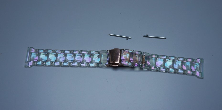 Pasek/bransoletka do zegarka z przezroczystego tworzywa. Zapięcie ze stali nierdzewnej. Szerokość paska 2 cm. Długość 17 cm. Stan nowy, nieużywany.