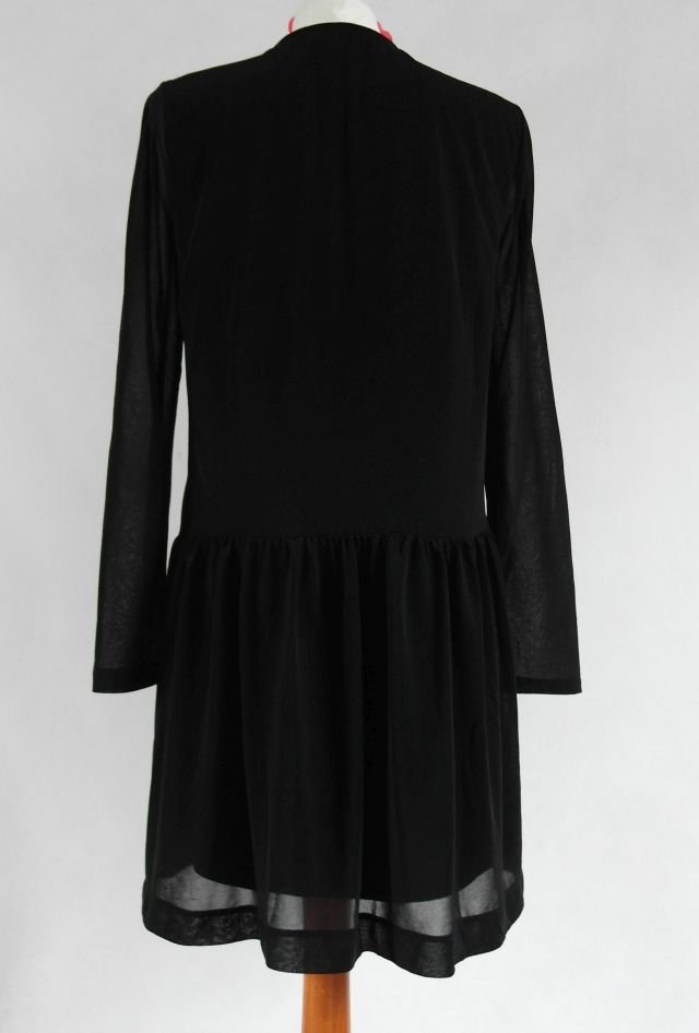 ciekawy przód z długim zasłoniętym dekoltem i marszczonym centralnie dołem.Rękawy przeźroczyste. świetna do wysokich butów albo cięższych, typu glany. Całość z tego samego materiału co rękawy, tylko na podszewce.stan bardzo dobry, bez zaciągnieć.