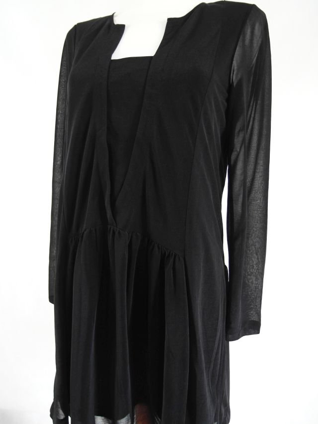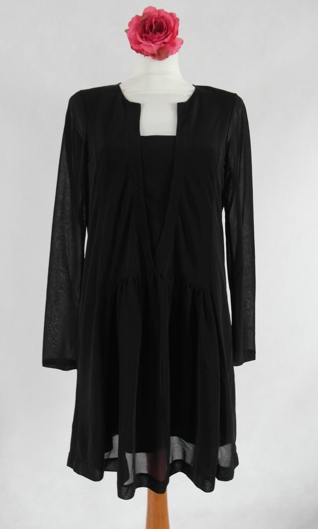 ciekawy przód z długim zasłoniętym dekoltem i marszczonym centralnie dołem.Rękawy przeźroczyste. świetna do wysokich butów albo cięższych, typu glany. Całość z tego samego materiału co rękawy, tylko na podszewce.stan bardzo dobry, bez zaciągnieć.