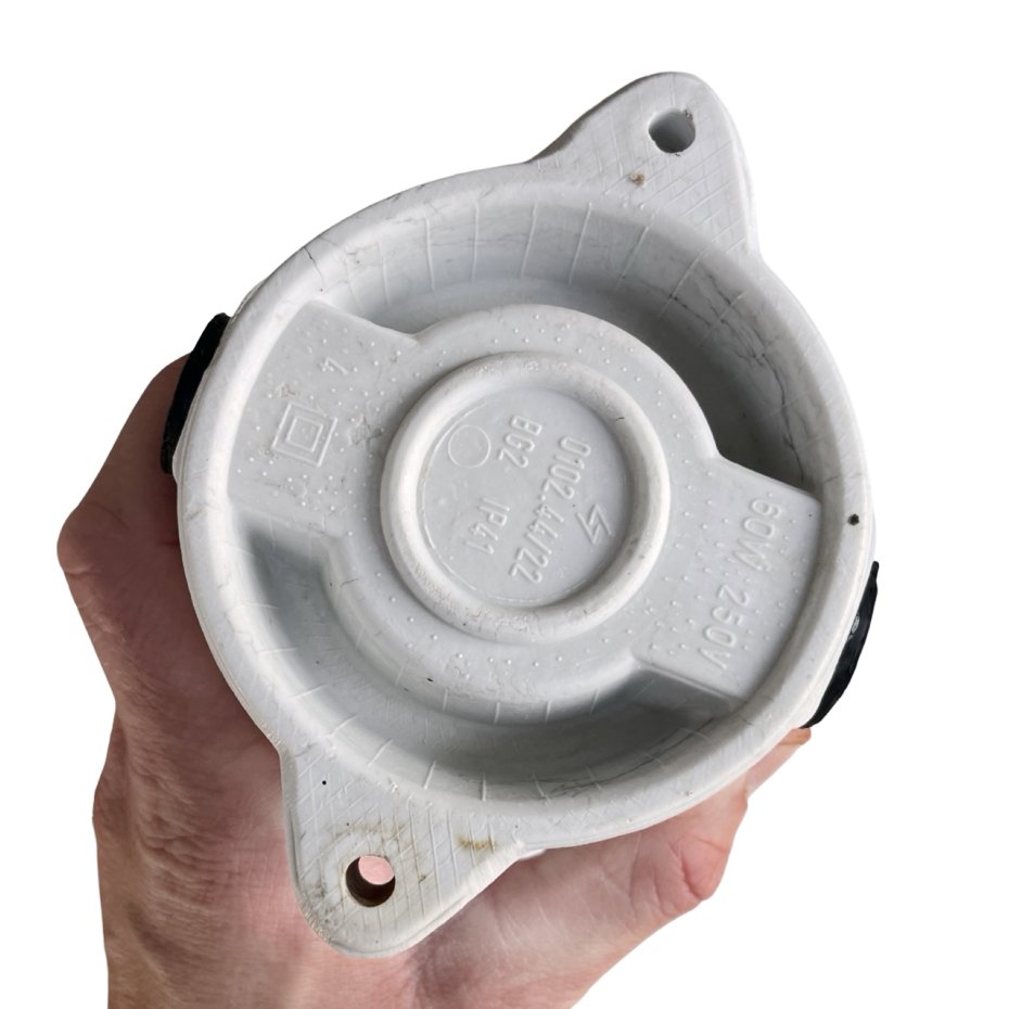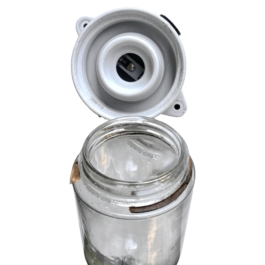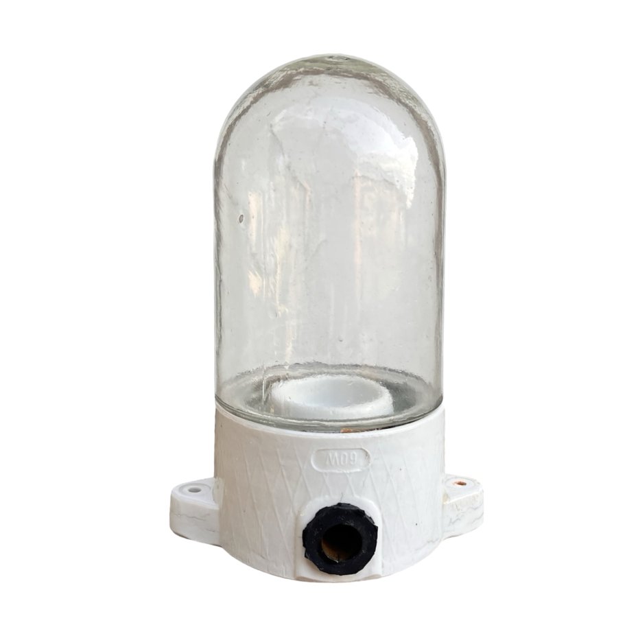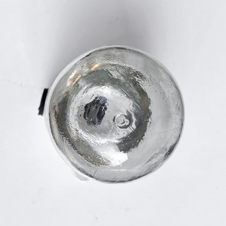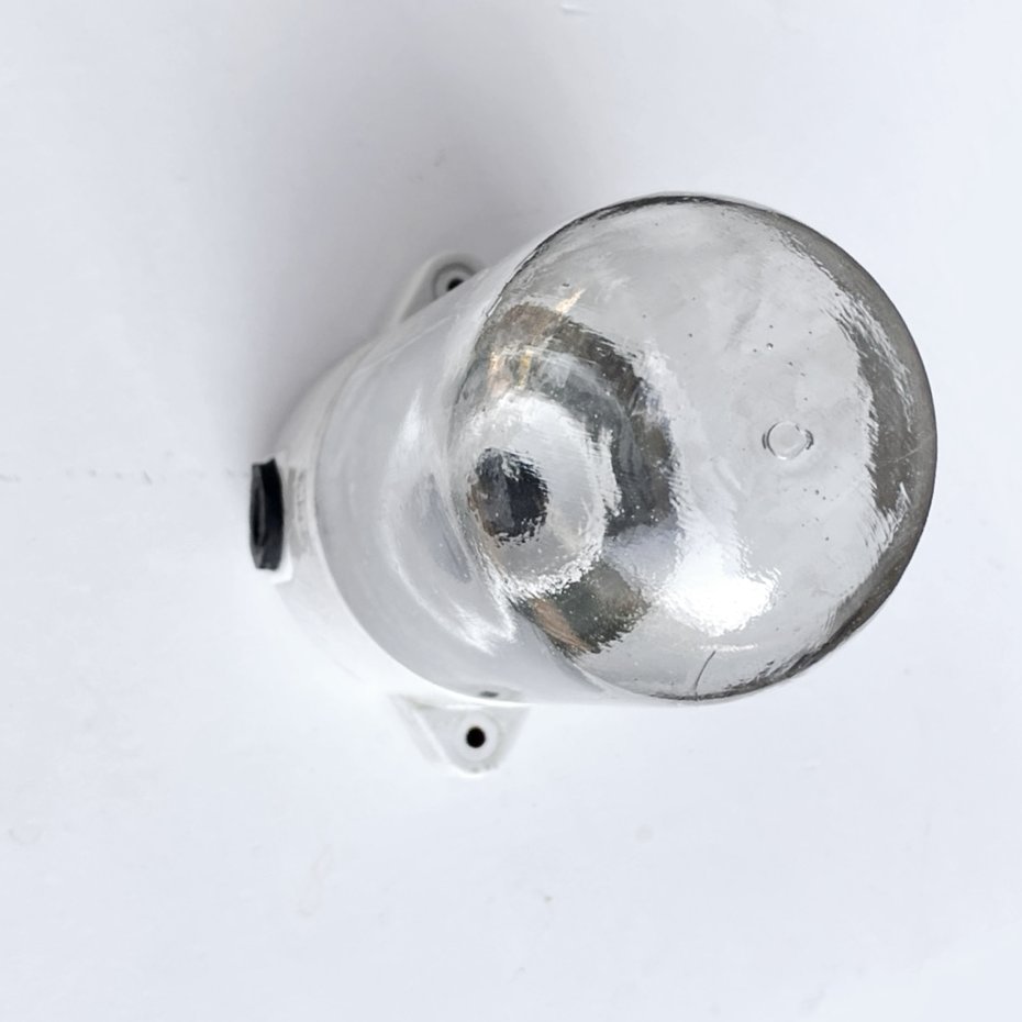 Szklany kinkiet w stylu industrialnym Lindner & Co. LJS wyprodukowany w Niemczech na początku lat 70. Lampa o klasycznym, sferycznym, wydłużonym kształcie została wykonana ze szkła dmuchanego, klosz osadzony został na ceramicznej podstawie. Stan zachowania oryginalny, bardzo dobry, nosi normalne ślady użytkowania. Lampa na pojedynczą żarówkę E27 do 75W. Lampa mogą być również używana na zewnątrz