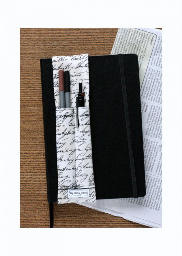 Przybornik pasuje na kalendarz czy zeszyt formatu A5 o grubości 1,5-2cm. Istnieje możliwość uszycia przybornika na większy/grubszy notes.