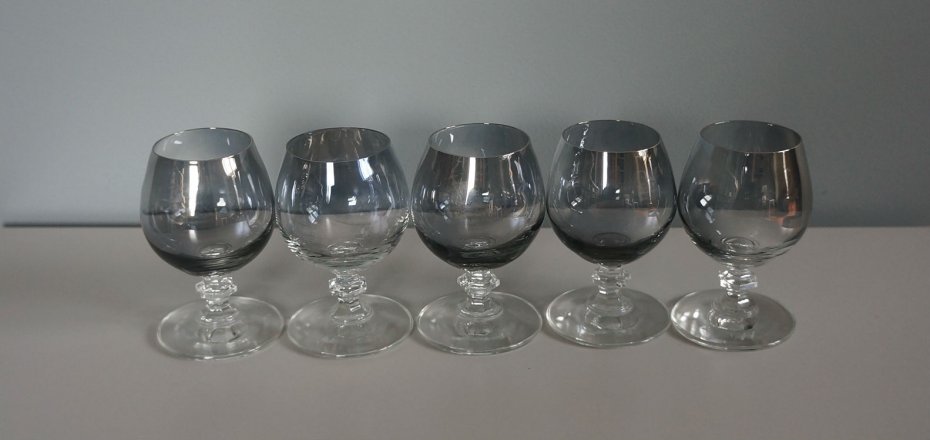 Pięć kieliszków na nóżce z przydymionego, opalizującego szkła. Stan bardzo dobry.