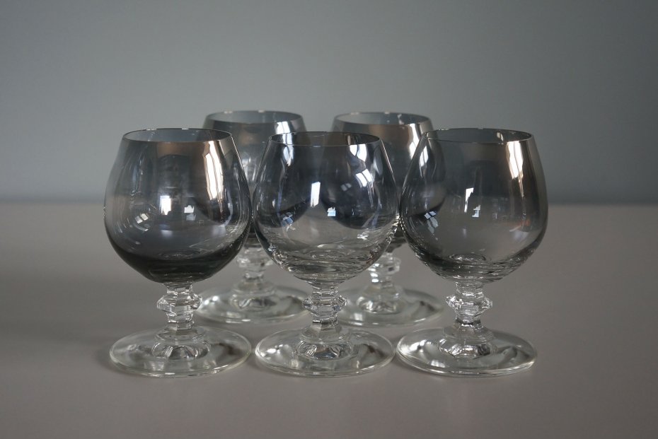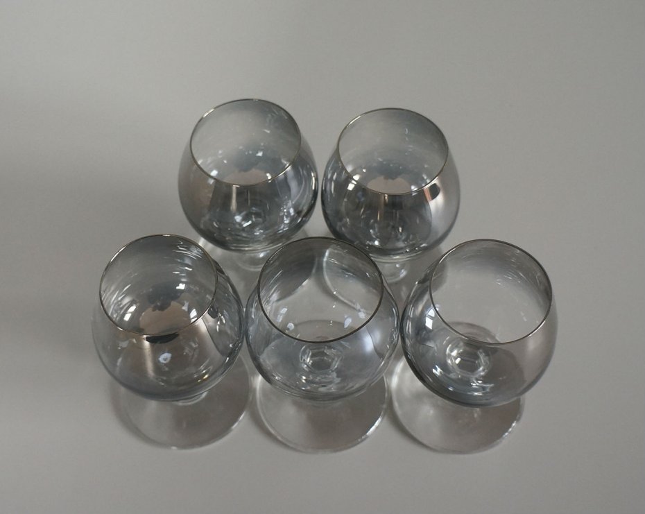 Pięć kieliszków na nóżce z przydymionego, opalizującego szkła. Stan bardzo dobry.