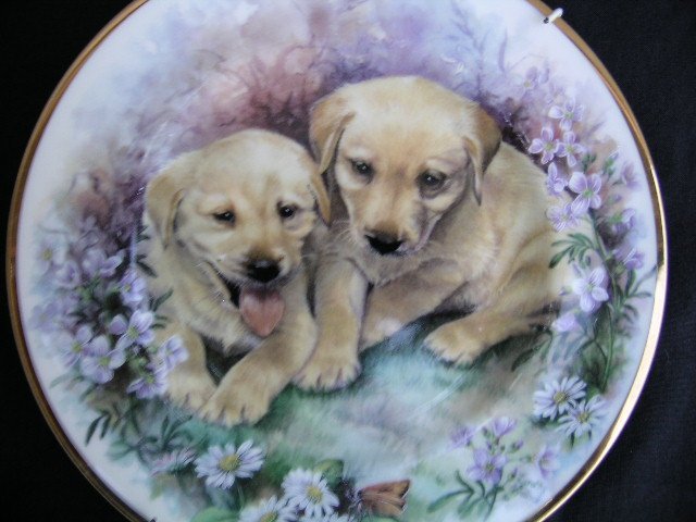 Porcelanowy talerz dekoracyjny z portretem psich maleństw w niespodziewanie sielankowym, ogrodowo-kwiatowym zaciszu... jest nawet motyl-ćma :) Seria malarska autorstwa Dorothy Wallace. Kolekcjonerski, sygnowany koronnie Stoke-On-Trent. Przyjemnie jedwabiste, błyszczące szkliwienie i precyzja nadruku. Przetarcia granicy okręgów i na pyszczku przyjaciela po lewej stronie. Rant złocony. 20,5 x 2,5 cm. Stan zachowania dobry minus przetarcia. Z tyłu profesjonalny uchwyt do powieszenia.