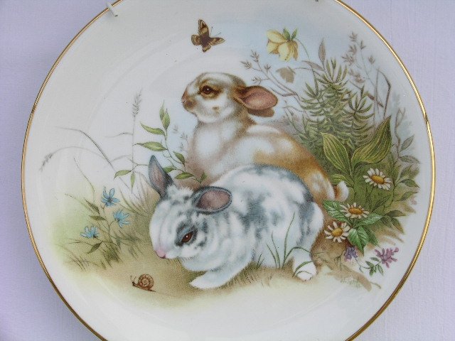 Talerz porcelanowy z uroczą króliczą obecnością, na jedwabiście błyszcząco szkliwiony, z kolekcjonerskiej serii Good Companions, talerz nr 4 - Letnie Dni. Sygnatura Royal Grafton. Złocenie na rancie. Z tyłu profesjonalny uchwyt do powieszenia, ale sam talerz i użytkowym być może. Do kolekcji i na prezent. 21,5 x 1,5 cm. Stan zachowania bardzo dobry.