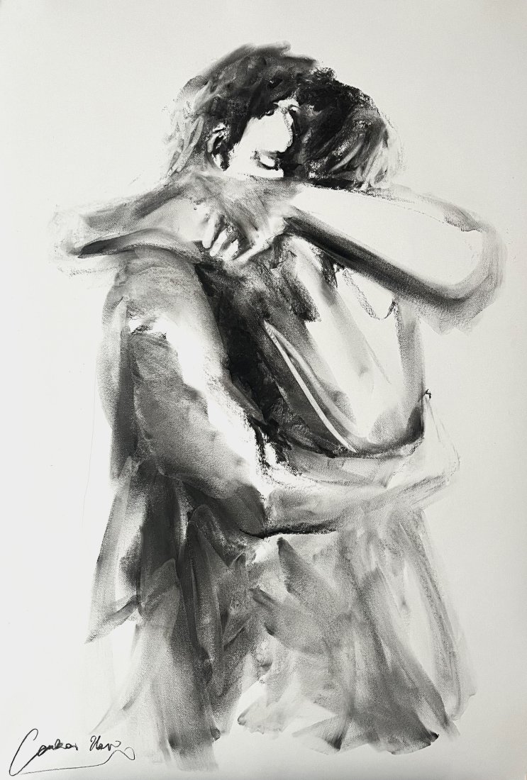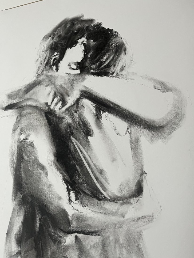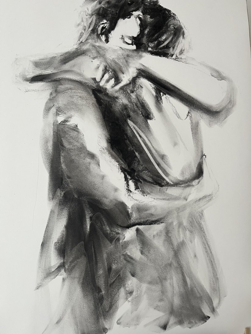 Rysunek w węglu na papierze w tonacji śmietankowej bieli.