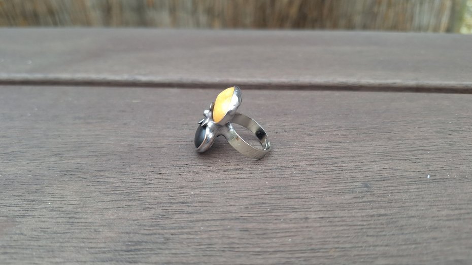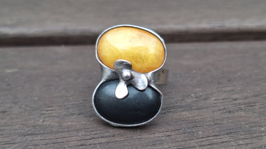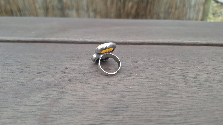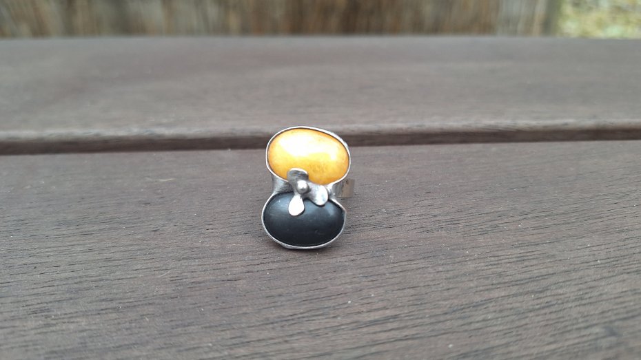 Pierścionek wykonany z miedzi, cyny, jadeitu i onyksu. Wymiary ok. 2.4 na 1.7 cm. Regulowany. Nie jest ciężki.