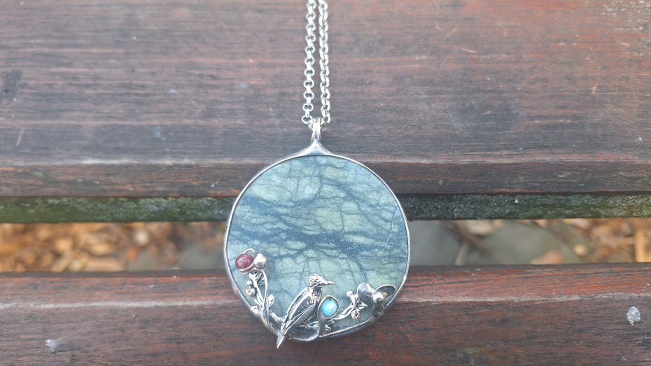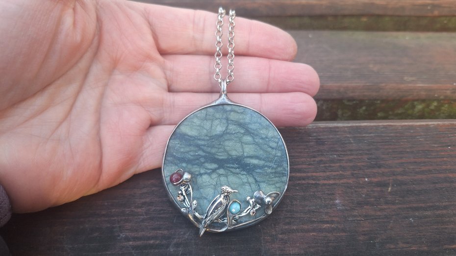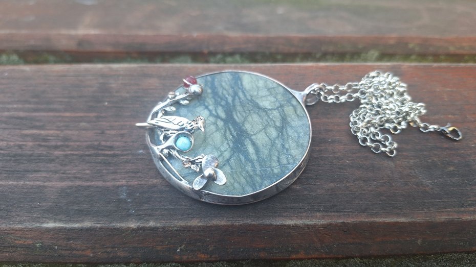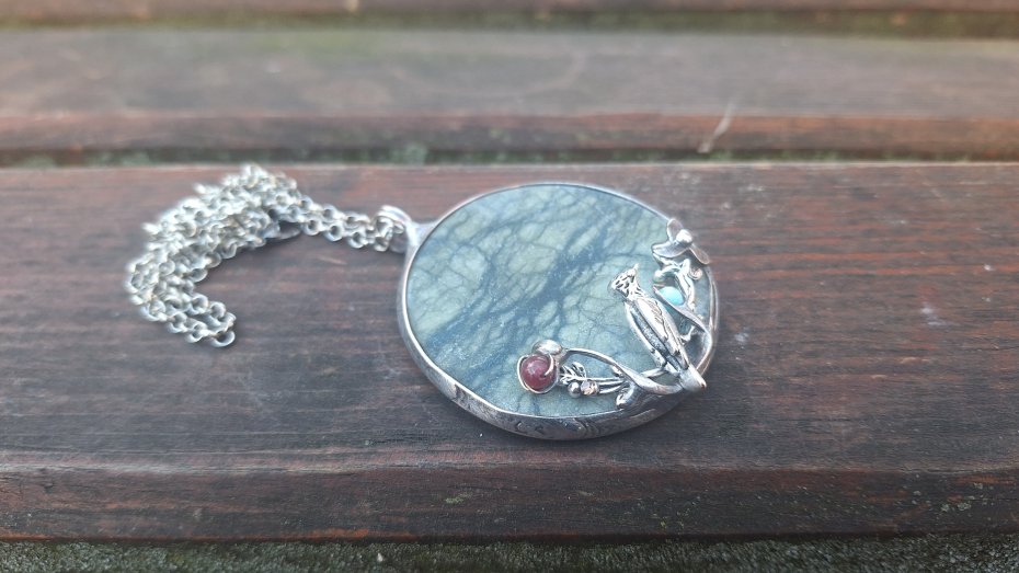 Wisiorek wykonany z miedzi, cyny, jadeitu, turmalinu i amazonitu. Wymiary ok. 5 na 5 cm. Zawieszony na łańcuszku o długości ok. 50 cm.