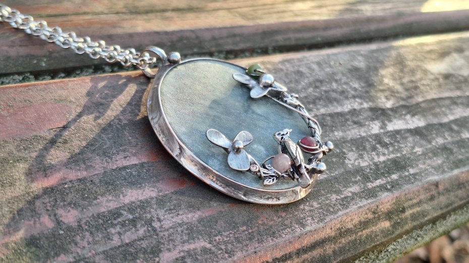 Wisiorek wykonany z miedzi, cyny, jadeitu i turmalinów. Wymiary ok. 5 na 5 cm. Zawieszony na łańcuszku o długości ok. 50 cm.