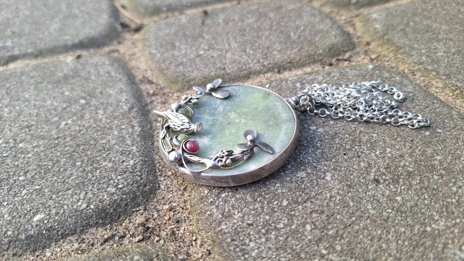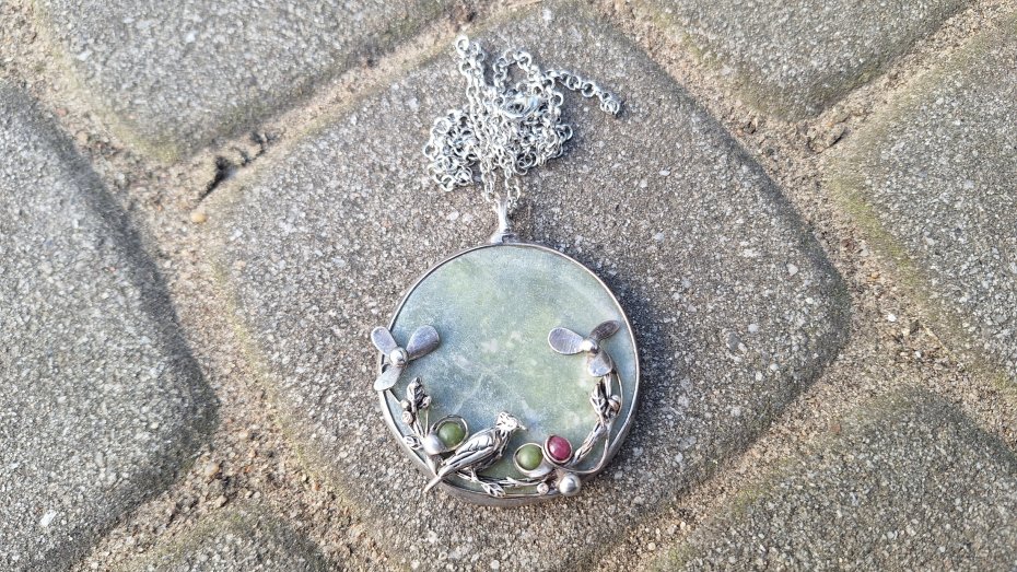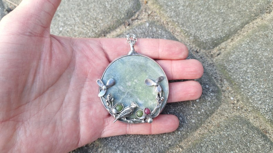 Wisiorek wykonany z miedzi, cyny, jadeitu i turmalinów. Wymiary ok. 5 na 5 cm. Zawieszony na łańcuszku o długości ok. 50 cm.