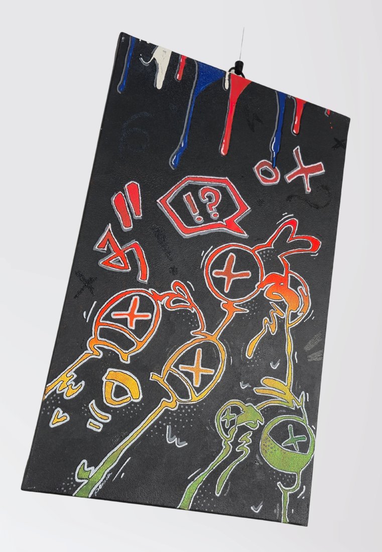 Nowoczesny obraz akrylowy w stylu miejskim, inspirowany estetyką graffiti. Przedstawia dynamiczne, abstrakcyjne ptaki w intensywnych, jaskrawych kolorach, które kontrastują z ciemnym tłem. Na powierzchni widoczna jest delikatna struktura 3D, nadająca pracy wyjątkowej głębi i charakteru.