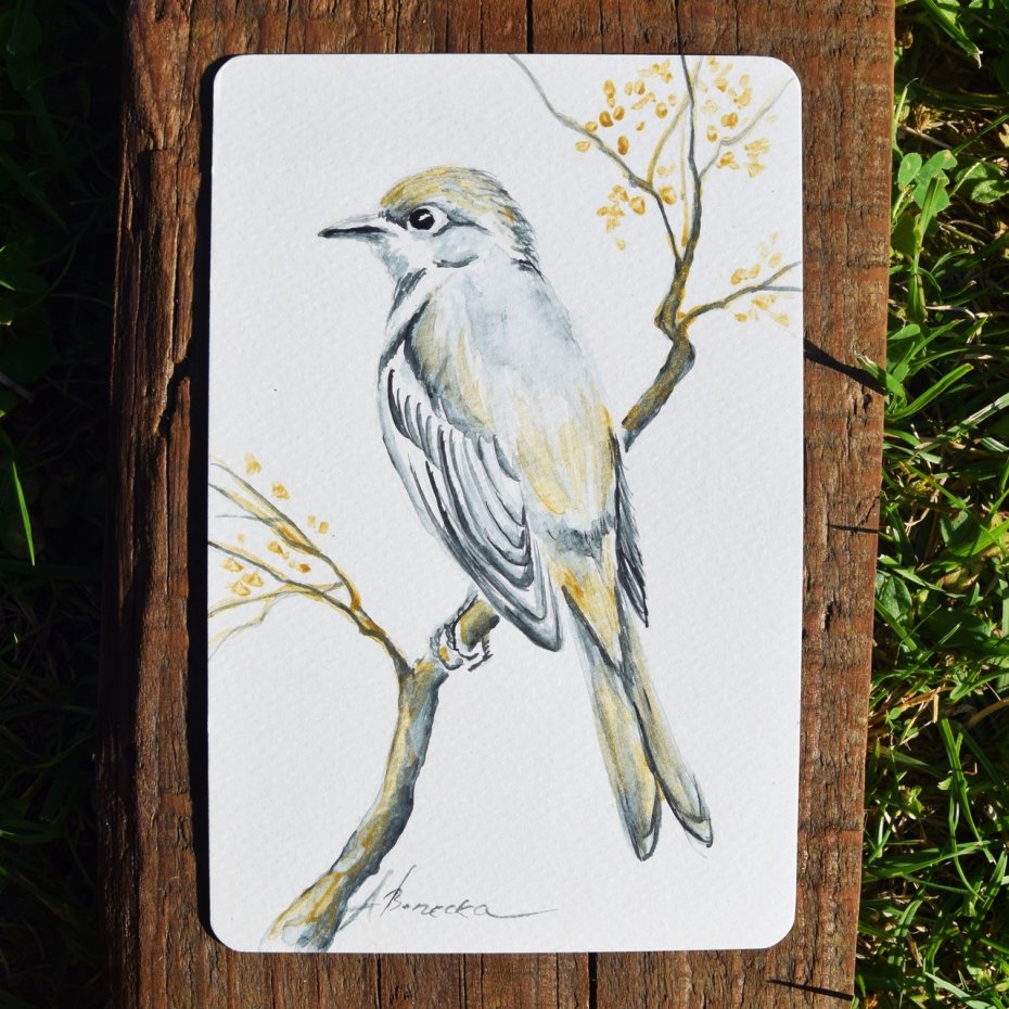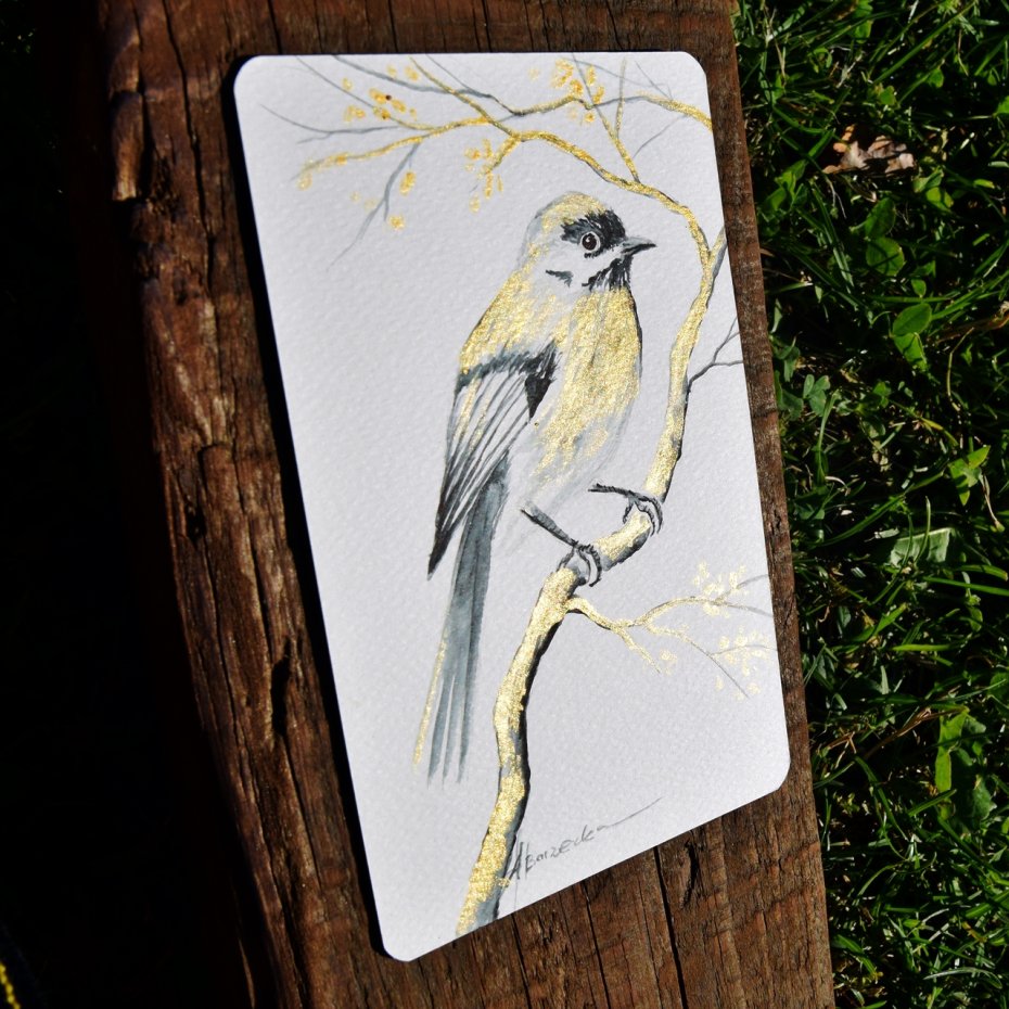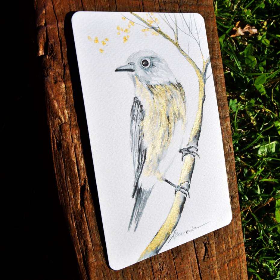 Komplet 3 oryginalnych akwarel - miniatur, z dodatkiem złotej farby akrylowej, malowanych na papierze akwarelowym w kolorze ecru/kremowym o gramaturze 300 gr. w formacie 10/15 cm (z zaokrąglonymi narożnikami).