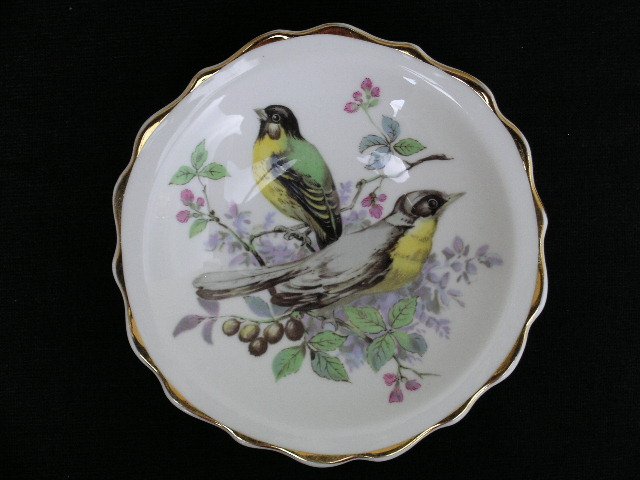Porcelanowy talerzyk z ryflowanym rantem - barwną ptasią malaturą zdobiony. Obrzeże złocone. 11,5 x 2 cm. Sygnowany. Stan zachowania bardzo dobry.