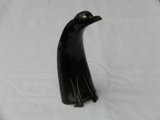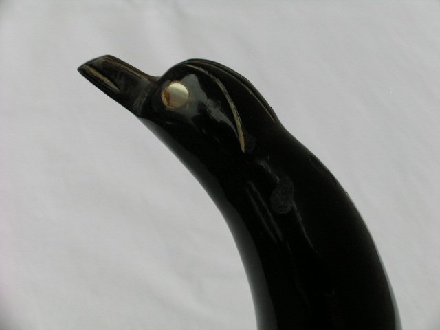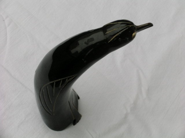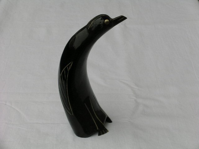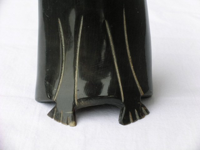 Wyjątkowa, ręcznie wykonana, etnicznego pochodzenia rzeźba z czarnego rogu. Pusta w środku, ryta. Obecność raczej ptasio-pingwinia... Oczy dla ożywienia - z masy perłowej. I te stópki ! Rękodzieło i ludowe i bardzo nowoczesne w formie zarazem. Minimalizm i charakter. 5 x 11 x 16 cm. Stan zachowania bardzo dobry.