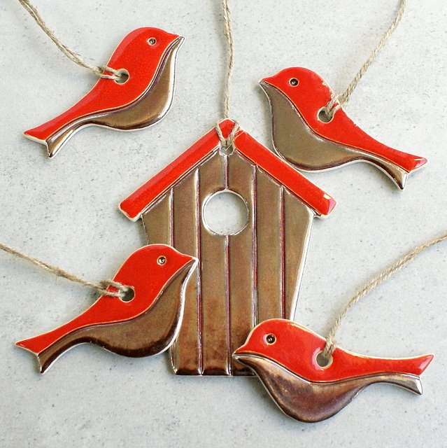 Zestaw 5 ceramicznych zawieszek, kolorowych i bardzo błyszczących (4 ptaszki i ptasia budka:). Pokryte bardzo błyszczącymi szkliwami w kolorze soczystej czerwieni i starego złota. Wymiary: ptaszki ok. 6 x 3 cm; budka ok. 8,5 x 7 cm. Ozdobnie opakowane w pudełko, wyściełane siankiem drzewnym i przyozdobione ceramiczną ozdobą. Polecam.