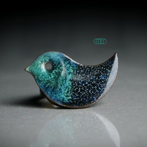Oryginalna ceramiczna broszka, wykonana z delikatnej gliny kamionkowej, szkliwiona błyszczącym zielonym i błękitnym szkliwem, tył i boki czekoladowobrązowe, zapięcie w kolorze starego złota. Długość ok. 3,8cm. Polecam . Termin realizacji zamówienia to 1-2 dni