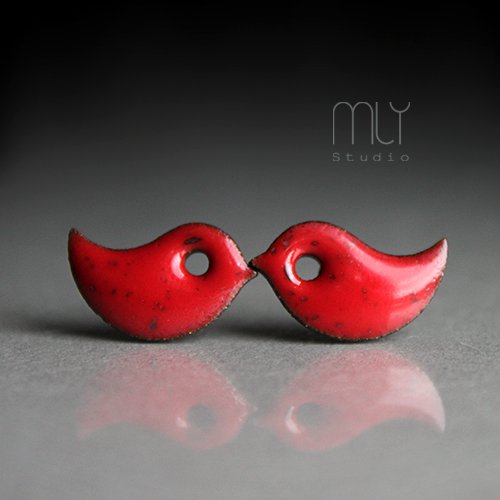 Efektowne kolczyki w formie sztyftów, ręcznie wykonane z delikatnej kamionki, jednostronnie szkliwione czerwonym szkliwem z efektem plamek na antyalergicznych sztyftach w kolorze srebrnym.długość elementu ceramicznego ok. 17mm, Polecam