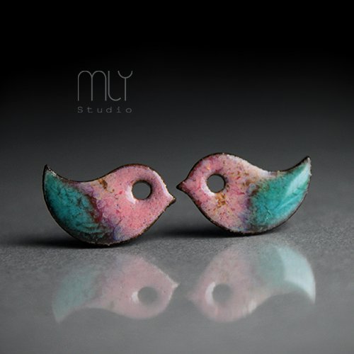 Efektowne kolczyki w formie sztyftów, ręcznie wykonane z delikatnej kamionki, jednostronnie szkliwione różowo zielonym szkliwem z efektem plamek na antyalergicznych sztyftach w kolorze srebrnym.długość elementu ceramicznego ok. 17mm, Polecam