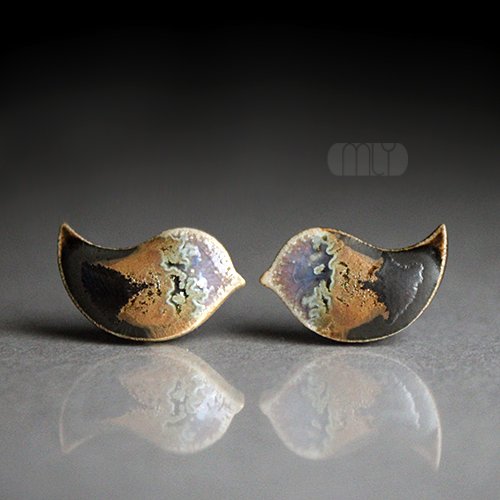 Efektowne kolczyki w formie sztyftów, ręcznie wykonane z delikatnej kamionki, jednostronnie szkliwione czarnym i brązowym szkliwem z efektem plamek, na antyalergicznych sztyftach w kolorze srebrnym.długość elementu ceramicznego ok. 17mm, Polecam