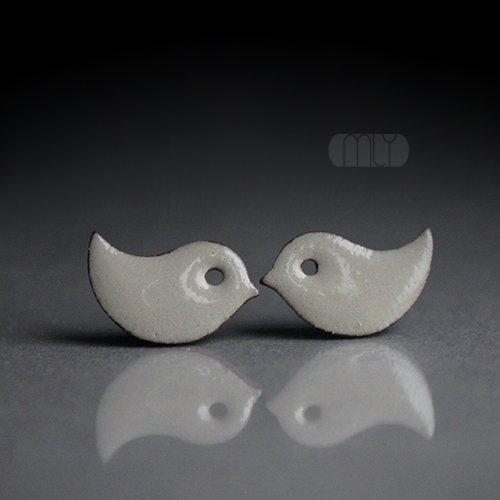 Efektowne kolczyki w formie sztyftów, ręcznie wykonane z delikatnej kamionki, jednostronnie szkliwione szarobeżowym szkliwem z efektem plamek, na antyalergicznych sztyftach w kolorze srebrnym.długość elementu ceramicznego ok. 17mm, Polecam