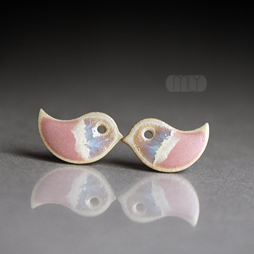 Efektowne kolczyki w formie sztyftów, ręcznie wykonane z delikatnej kamionki, jednostronnie szkliwione różowo beżowym szkliwem z efektem plamek, na antyalergicznych sztyftach w kolorze srebrnym.długość elementu ceramicznego ok. 17mm, Polecam