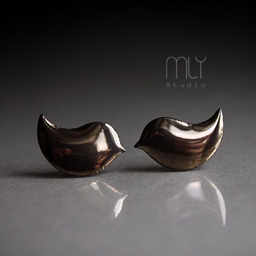 Efektowne kolczyki w formie sztyftów, ręcznie wykonane z delikatnej kamionki, jednostronnie szkliwione srebrno stalowym szkliwem z efektem plamek na antyalergicznych sztyftach w kolorze srebrnym.długość elementu ceramicznego ok. 17mm, Polecam