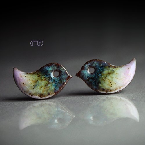 Efektowne kolczyki w formie sztyftów, ręcznie wykonane z delikatnej kamionki, jednostronnie szkliwione zielonym i jasnofioletowym szkliwem z efektem plamek na antyalergicznych sztyftach w kolorze srebrnym.długość elementu ceramicznego ok. 17mm, Polecam