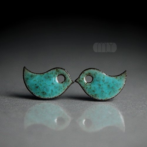 Efektowne kolczyki w formie sztyftów, ręcznie wykonane z delikatnej kamionki, jednostronnie szkliwione zielonym szkliwem z efektem plamek na antyalergicznych sztyftach w kolorze srebrnym.długość elementu ceramicznego ok. 17mm, Polecam