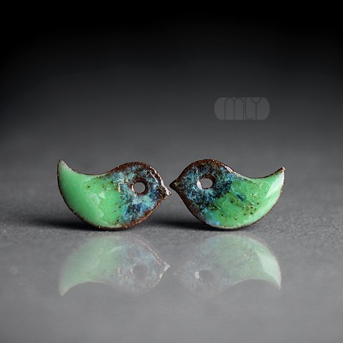 Efektowne kolczyki w formie sztyftów, ręcznie wykonane z delikatnej kamionki, jednostronnie szkliwione zielonym szkliwem z efektem plamek na antyalergicznych sztyftach w kolorze srebrnym.długość elementu ceramicznego ok. 17mm, Polecam