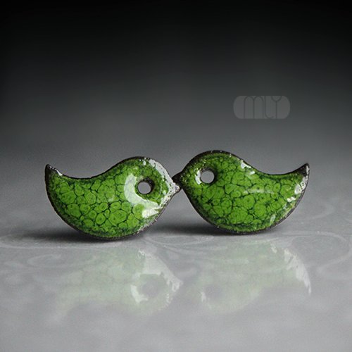 Efektowne kolczyki w formie sztyftów, ręcznie wykonane z delikatnej kamionki, jednostronnie szkliwione zielonym szkliwem z efektem plamek na antyalergicznych sztyftach w kolorze srebrnym.długość elementu ceramicznego ok. 17mm, Polecam