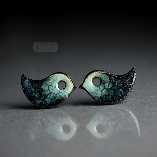 Efektowne kolczyki w formie sztyftów, ręcznie wykonane z delikatnej kamionki, jednostronnie szkliwione zielonym szkliwem z efektem plamek na antyalergicznych sztyftach w kolorze srebrnym.długość elementu ceramicznego ok. 17mm, Polecam