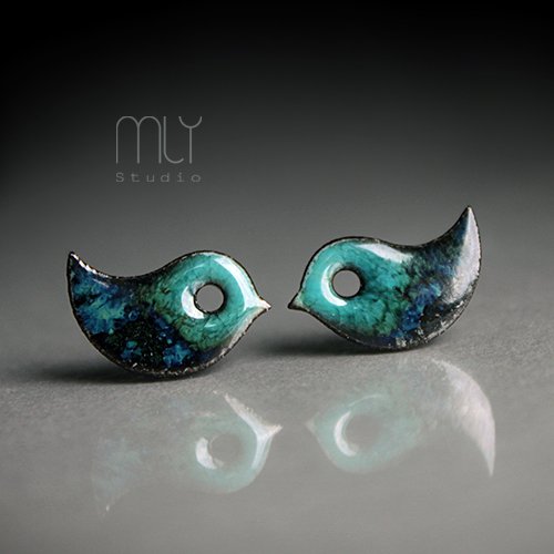 Efektowne kolczyki w formie sztyftów, ręcznie wykonane z delikatnej kamionki, jednostronnie szkliwione zielonym szkliwem z efektem plamek na antyalergicznych sztyftach w kolorze srebrnym.długość elementu ceramicznego ok. 17mm, Polecam