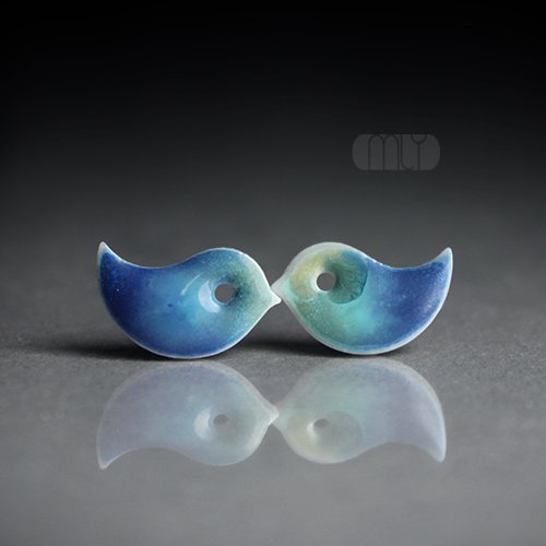 Efektowne kolczyki w formie sztyftów, ręcznie wykonane z delikatnej porcelany, jednostronnie szkliwione zielonkawo błękitnym szkliwem z efektem plamek na antyalergicznych sztyftach w kolorze srebrnym.długość elementu ceramicznego ok. 17mm, Polecam