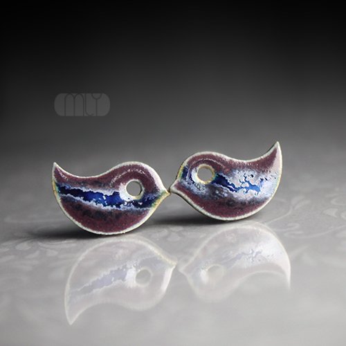 Efektowne kolczyki w formie sztyftów, ręcznie wykonane z delikatnej kamionki, jednostronnie szkliwione fioletowo błękitnym szkliwem z efektem plamek na antyalergicznych sztyftach w kolorze srebrnym.długość elementu ceramicznego ok. 17mm, Polecam