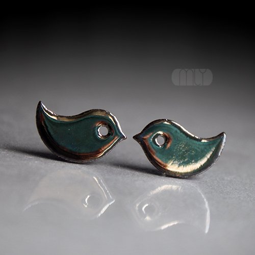 Efektowne kolczyki w formie sztyftów, ręcznie wykonane z delikatnej kamionki, jednostronnie szkliwione stalowo srebrzystym szkliwem z efektem plamek na antyalergicznych sztyftach w kolorze srebrnym.długość elementu ceramicznego ok. 17mm, Polecam