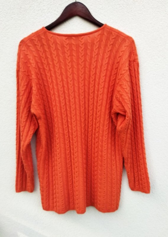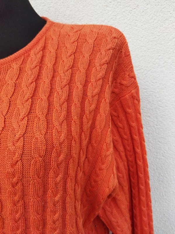 Ładny sweter z przewaga wełny w pomarańczowo-rudym kolorze z wzorem w warkoczyki.
