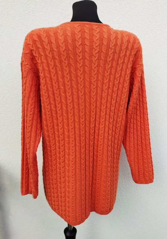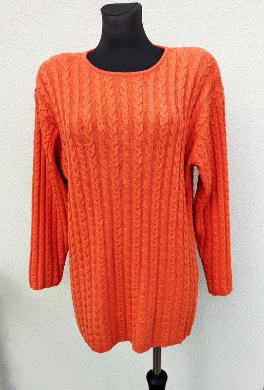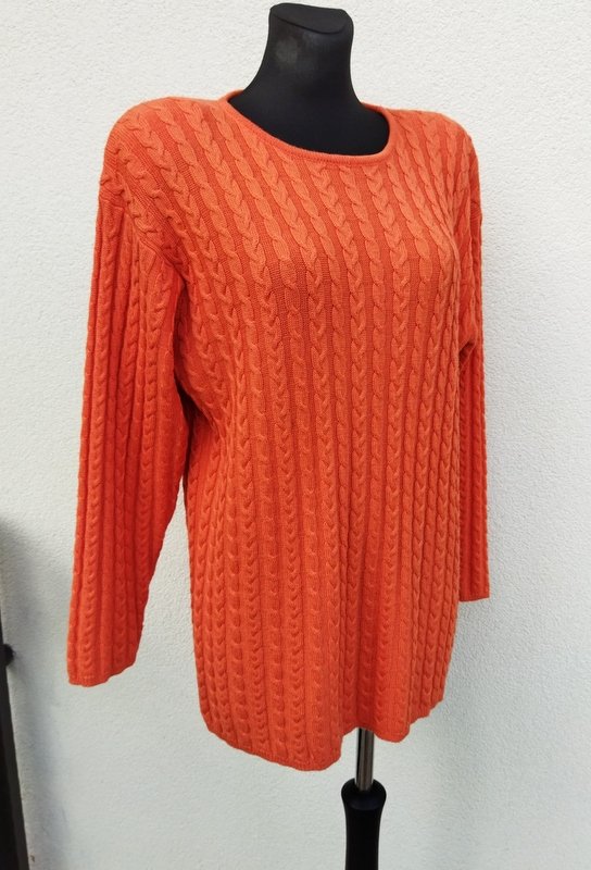 Ładny sweter z przewaga wełny w pomarańczowo-rudym kolorze z wzorem w warkoczyki.