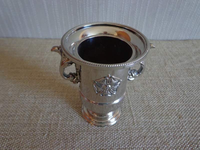 Ładny posrebrzany pucharek, wyrób angielski, kilka drobnych rysek, wewnątrz ubytki w srebrzeniu.